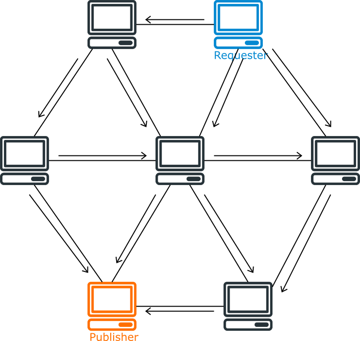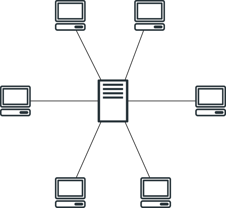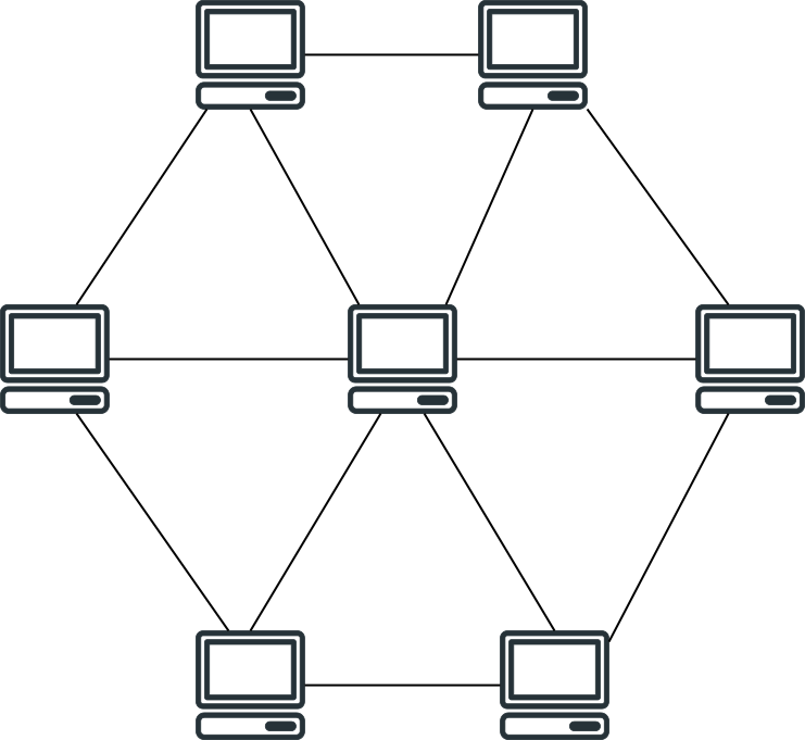1. 引言相信没有人没使用过 P2P 技术. BT 种子和磁力链接就是最常见的 P2P 技术, 使用 P2P 技术, 文件不再需要集中存储在一台服务器上, 而是分散再各个用户的节点上, 每个人都是服务的提供者, 也是服务的使用者. 这样的系统具有高可用性, 不会由于一两台机的宕机而导致整个服务不可用. 那么这样一个系统是怎样实现的, 如何做到去中心化(decentralization)和自我组织(self-organization)的呢? 这篇文章我们来讨论一下这个问题. 这篇文章先会介绍 P2P 网络的整体思路, 并引出 P2P 网络的主角 - 分布式哈希表(Distributed Hash Table, DHT); 接着会介绍两种分布式哈希表算法. 这些会让你对 P2P 技术有一个较为具体的了解. 2. P2P 网络的概述2.1 传统 CS 网络和 P2P 网络CS 架构即 Client-Server 架构, 由服务器和客户端组成: 服务器为服务的提供者, 客户端为服务的使用者. 我们如今使用的很多应用程序例如网盘, 视频应用, 网购平台等都是 CS 架构. 它的架构如下图所示: 当然服务器通常不是一个单点, 往往是一个集群; 但本质上是一样的. CS 架构的问题在于, 一旦服务器关闭, 例如宕机, 被 DDoS 攻击或者被查水表, 客户端就无法使用了, 服务也就失效了. 为了解决这个问题, 人们提出了 P2P 网络(Peer-to-peer Networking). 在 P2P 网络中, 不再由中心服务器提供服务, 不再有”服务器”的概念, 每个人即使服务的提供者也是服务的使用者 – i.e., 每个人都有可能是服务器. 我们常用的 BT 种子和磁力链接下载服务就是 P2P 架构. 人们对 P2P 系统作了如下定义:
