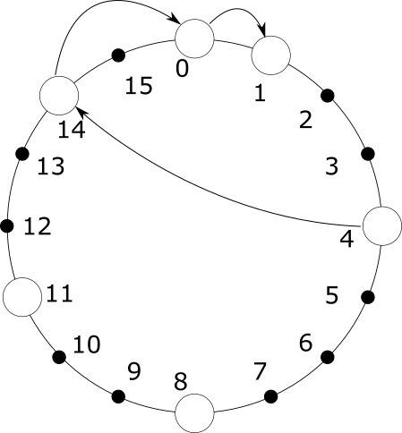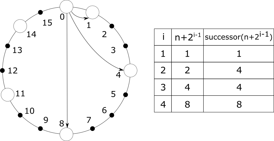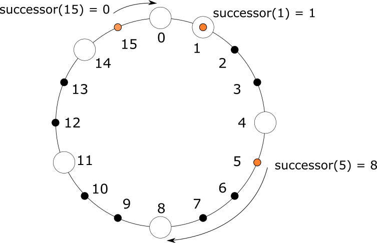 一个 P2P 系统是每个节点都是平等, 自主的一个自我组织的系统, 目的是在避免中心服务的网络环境中共享使用分布式资源. P2P 系统的架构如上图所示. 由于去掉了中心服务器, P2P 系统的稳定性就强很多: 少数几个个节点的失效几乎不会影响整个服务; 节点多为用户提供, 可以做到 “野火烧不尽, 春风吹又生”. 即使有人想恶意破坏, 也无法对整个系统造成有效打击. 2.2 朴素的 P2P 网络P2P 网络需要解决的一个最重要的问题就是, 如何知道用户请求的资源位于哪个节点上. 在第一代 P2P 网络中, 人们设置了一台中央服务器来管理资源所处的位置. 当一个用户想要发布资源, 他需要告诉中央服务器它发布的资源信息和自己的节点信息; 当其他用户请求资源的时候, 需要先请求中央服务器以获取资源发布者的节点信息, 再向资源发布者请求资源. 这种 P2P 网络的好处是效率高, 只需要请求一次中央服务器就可以发布或获取资源. 然而它的缺点也很明显: 中央服务器是这个网络系统最脆弱的地方, 它需要存储所有资源的信息, 处理所有节点的请求; 一旦中央服务器失效, 整个网络就无法使用. 早期的另外一种 P2P 网络采取了不同的策略, 它不设置中央服务器; 当用户请求资源时, 它会请求它所有的邻接节点, 邻接节点再依次请求各自的邻接节点, 并使用一些策略防止重复请求, 直到找到拥有资源的节点. 也就是说, 这是一种泛洪搜索(Flooding Search). 这种 P2P 网络去除了中央服务器, 它的稳定性就强多了. 然而它太慢了. 一次查找可能会产生大量的请求, 可能会有大量的节点卷入其中. 一旦整个系统中的的节点过多, 性能就会变得很差. 2.3 分布式哈希表为了解决这些问题, 分布式哈希表应运而生. 在一个有 个节点的分布式哈希表中, 每个节点仅需存储 个其他节点, 查找资源时仅需请求 个节点, 并且无需中央服务器, 是一个完全自组织的系统. 分布式哈希表有很多中实现算法, 第 3 节和第 4 节会详细介绍其中的两种. 这里我们先来看看它们共通的思想. 地址管理首先, 在分布式哈希表中, 每个节点和资源都有一个唯一标识, 通常是一个 160 位整数. 为方便起见, 我们称节点的唯一标识为 ID, 称资源的唯一标识为 Key. 我们可以把一个节点的 IP 地址用 SHA-1 算法哈希得到这个节点的 ID; 同样地, 把一个资源文件用 SHA-1 算法哈希就能得到这个资源的 Key 了. 定义好 ID 和 Key 之后, 就可以发布和存储资源了. 每个节点都会负责一段特定范围的 Key, 其规则取决于具体的算法. 例如, 在 Chord 算法中, 每个 Key 总是被第一个 ID 大于或等于它的节点负责. 在发布资源的的时候, 先通过哈希算法计算出资源文件的 Key, 然后联系负责这个 Key 的节点, 把资源存放在这个节点上. 当有人请求资源的时候, 就联系负责这个 Key 的节点, 把资源取回即可. 发布和请求资源有两种做法, 一种是直接把文件传输给负责的节点, 由它存储文件资源; 请求资源时再由这个节点将文件传输给请求者. 另一种做法是由发布者自己设法存储资源, 发布文件时把文件所在节点的地址传输给负责的节点, 负责的节点仅存储一个地址; 请求资源的时候会联系负责的节点获取资源文件的地址, 然后再取回资源. 这两种做法各有优劣. 前者的好处是资源的发布者不必在线, 请求者也能获取资源; 坏处是如果文件过大, 就会产生较大的传输和存储成本. 后者的好处是传输和存储成本都比较小, 但是资源的发布者, 或者说资源文件所在的节点必须一直在线. 路由算法上面我们简述了地址系统, 以及如何发布和取回资源. 但是现在还有一个大问题: 如何找到负责某个特定 Key 的节点呢? 这里就要用到路由算法了. 不同的分布式哈希表实现有不同的路由算法, 但它们的思路是一致的. 首先每个节点会由若干个其他节点的联系方式(IP 地址, 端口), 称之为路由表. 一般来说一个有着 个节点的分布式哈希表中, 一个节点的路由表的长度为 . 每个节点都会按照特定的规则构建路由表, 最终所有的节点会形成一张网络. 从一个节点发出的消息会根据特定的路由规则, 沿着网络逐步接近目标节点, 最终达到目标节点. 在有着 个节点的分布式哈希表中, 这个过程的转发次数通常为 次. 自我组织(self-organization)分布式哈希表中的节点都是由各个用户组成, 随时有用户加入, 离开或失效; 并且分布式哈希表没有中央服务器, 也就是说着这个系统完全没有管理者. 这意味着分配地址, 构建路由表, 节点加入, 节点离开, 排除失效节点等操作都要靠自我组织策略实现. 要发布或获取资源, 首先要有节点加入. 一个节点加入通常有以下几步. 首先, 一个新节点需要通过一些外部机制联系分布式哈希表中的任意一个已有节点; 接着新节点通过请求这个已有节点构造出自己的路由表, 并且更新其他需要与其建立连接的节点的路由表; 最后这个节点还需要取回它所负责的资源. 此外我们必须认为节点的失效是一件经常发生的事, 必须能够正确处理它们. 例如, 在路由的过程中遇到失效的节点, 会有能够替代它的其他节点来完成路由操作; 会定期地检查路由表中的节点是否有效; 将资源重复存储在多个节点上以对抗节点失效等. 另外分布式哈希表中的节点都是自愿加入的, 也可以自愿离开. 节点离开的处理与节点失效类似, 不过还可以做一些更多的操作, 比如说立即