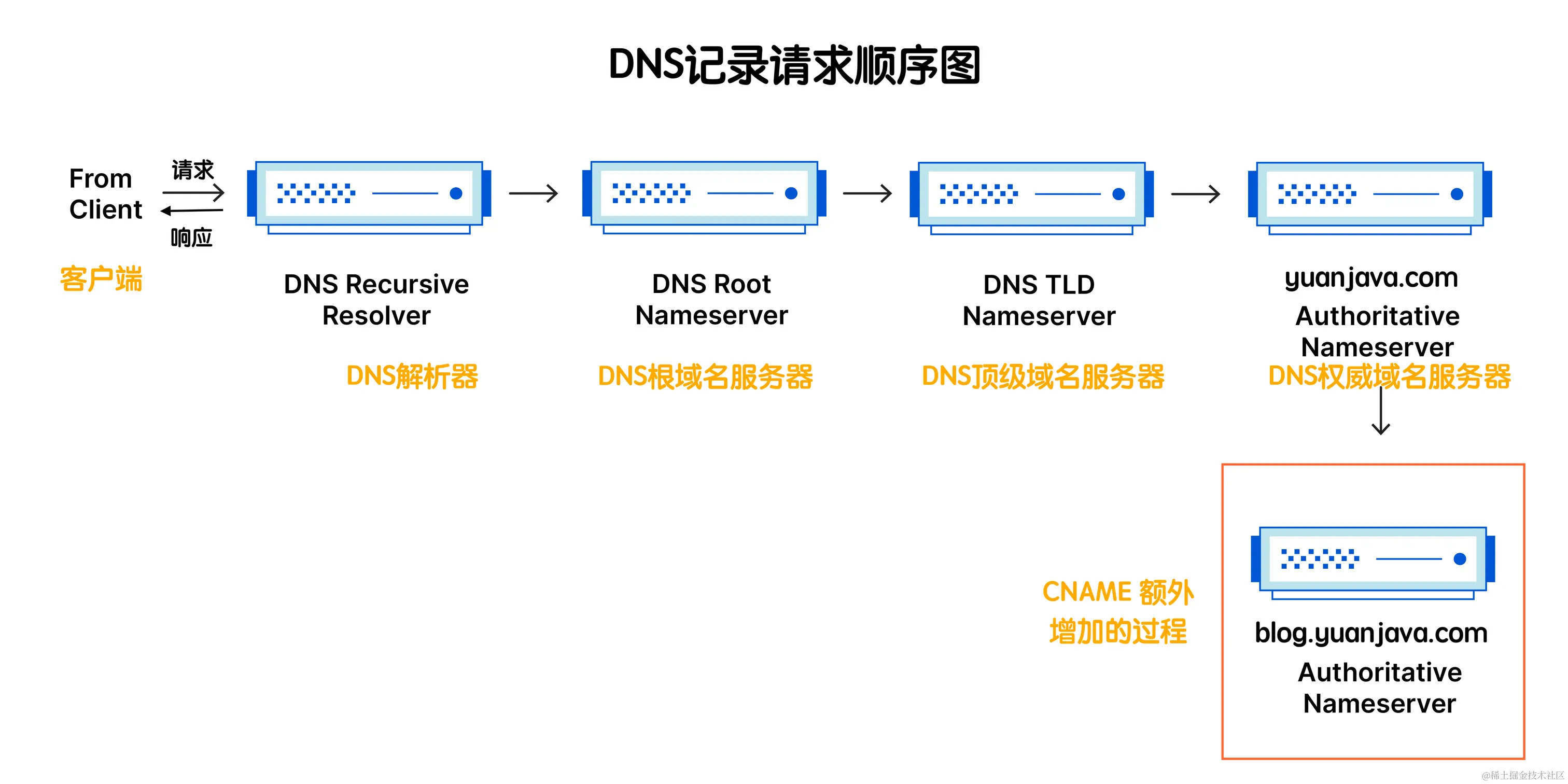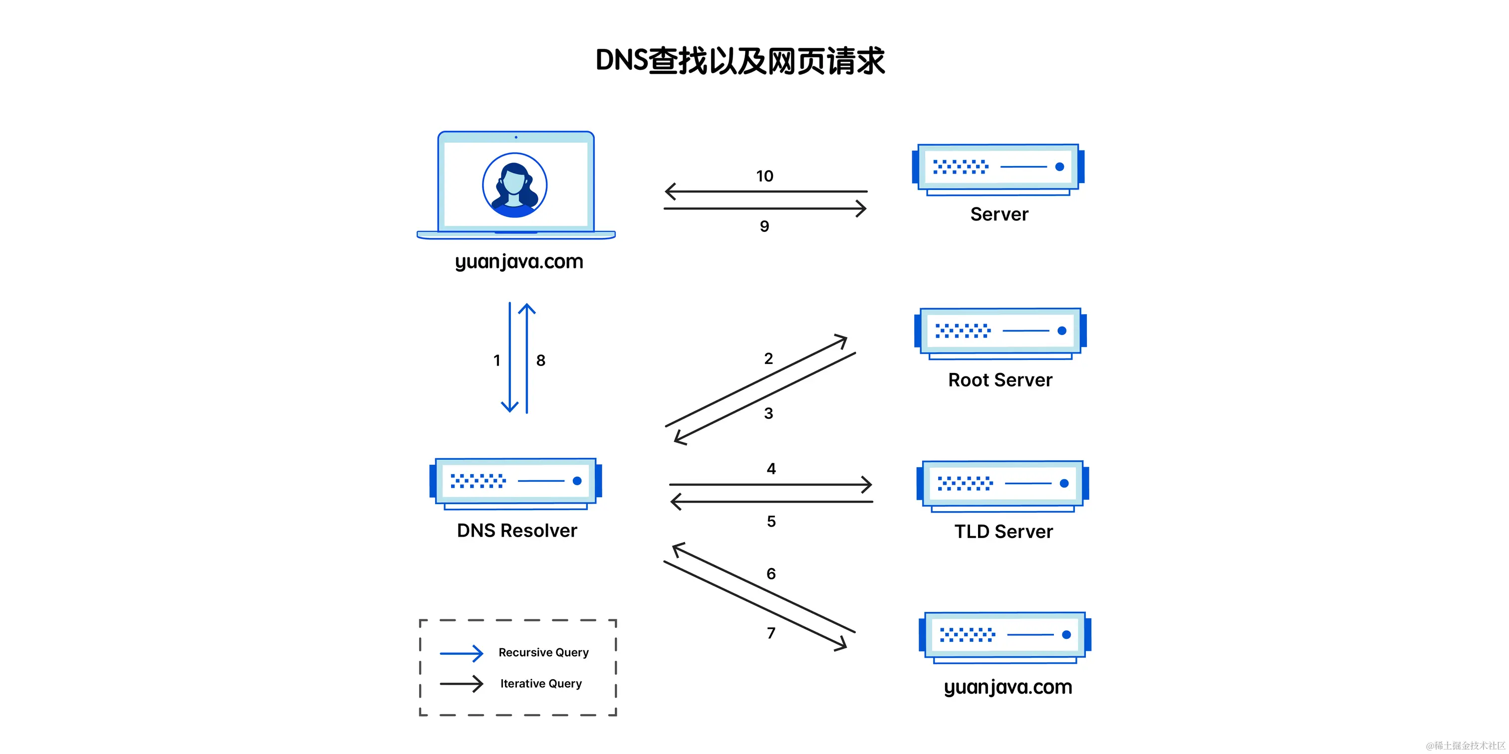 上述 8个 DNS查找步骤可以返回“yuanjava.com”的 IP地址后,最后,浏览器使用该 IP地址向服务器发出 HTTP请求,获取对应的数据显示在网页中。 整个过程如下图: