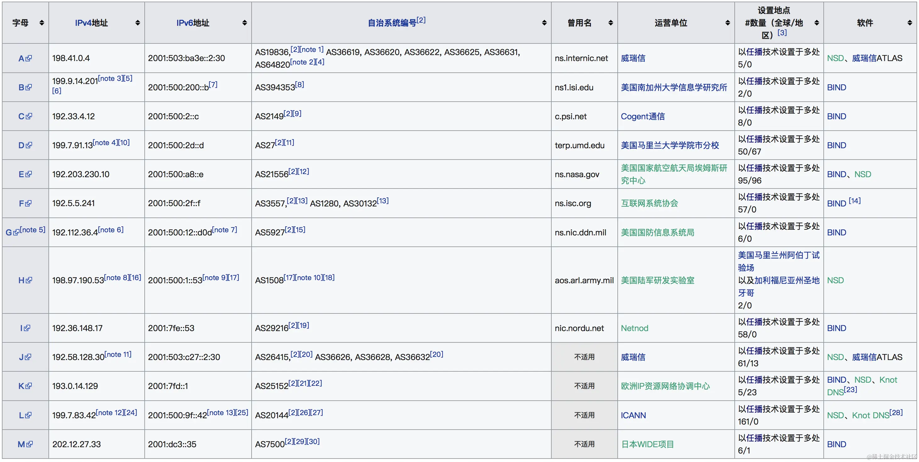1.DNS解析器DNS解析器是一种服务器,负责整个域名转IP的过程,当收到客户端 DNS查询请求时,DNS解析器会根据"DNS查询类型"来查询对应的 IP地址。因此,递归 DNS解析器是域名转IP的 2.根域名服务器根域名服务器是将人类可读的域名转换为 IP地址的第一步,它管理着根域名,根域名用一个点(.)表示,因此,可以把根域名服务器理解成一个 全球共有 13组根域名服务器,它们以英文字母“A到M”依序命名,网域名称格式为“A~M.root-servers.net”,具体信息如下表: