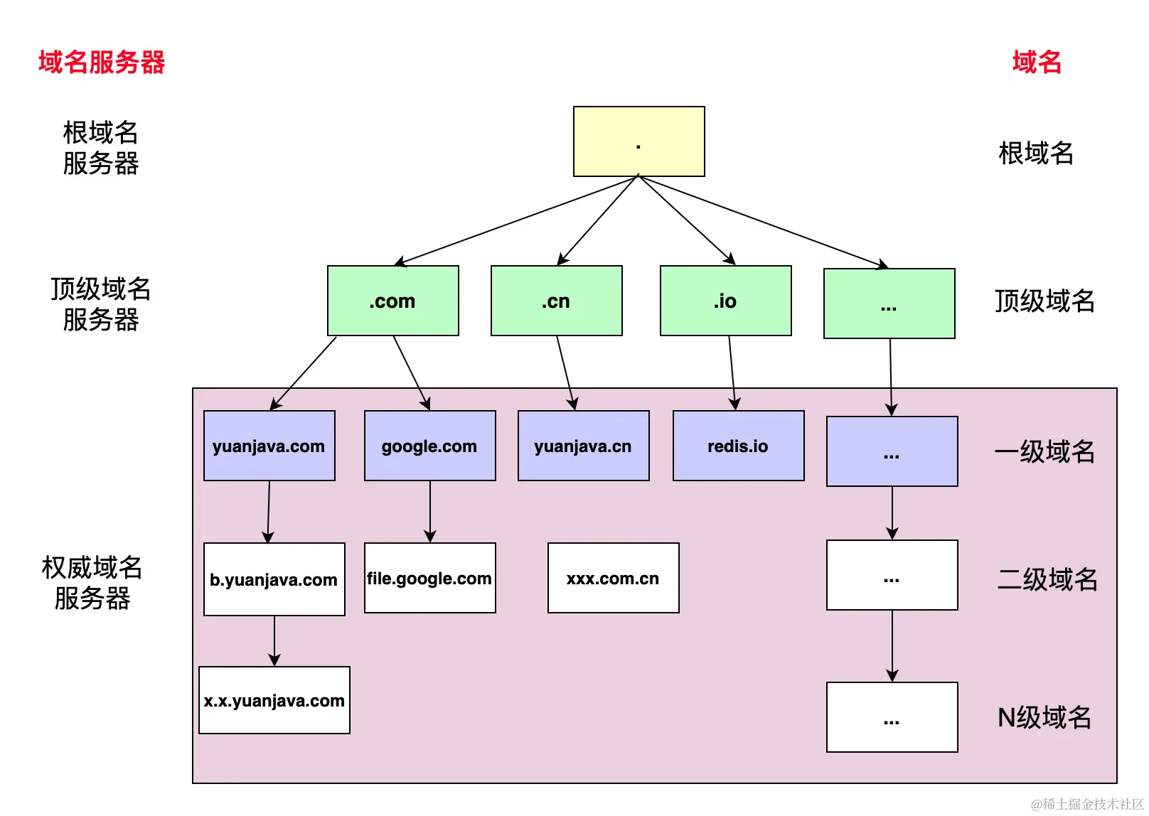 3.顶级域名服务器顶级域名服务器(top-level domain,简写 TLD),托管着一些顶级域名(比如 .com,.io, .net),它是域名转IP的第二步,可以把顶级域名服务器理解成一个 4.权威性域名服务器权威性域名服务器(Authoritative nameserver),它是真实存储具体域名的服务器,比如(example.com,redis.io)等,它是域名转IP的最后一步,如果权威性域名服务器能查询记录,则返回 IP地址,否则做以下处理: