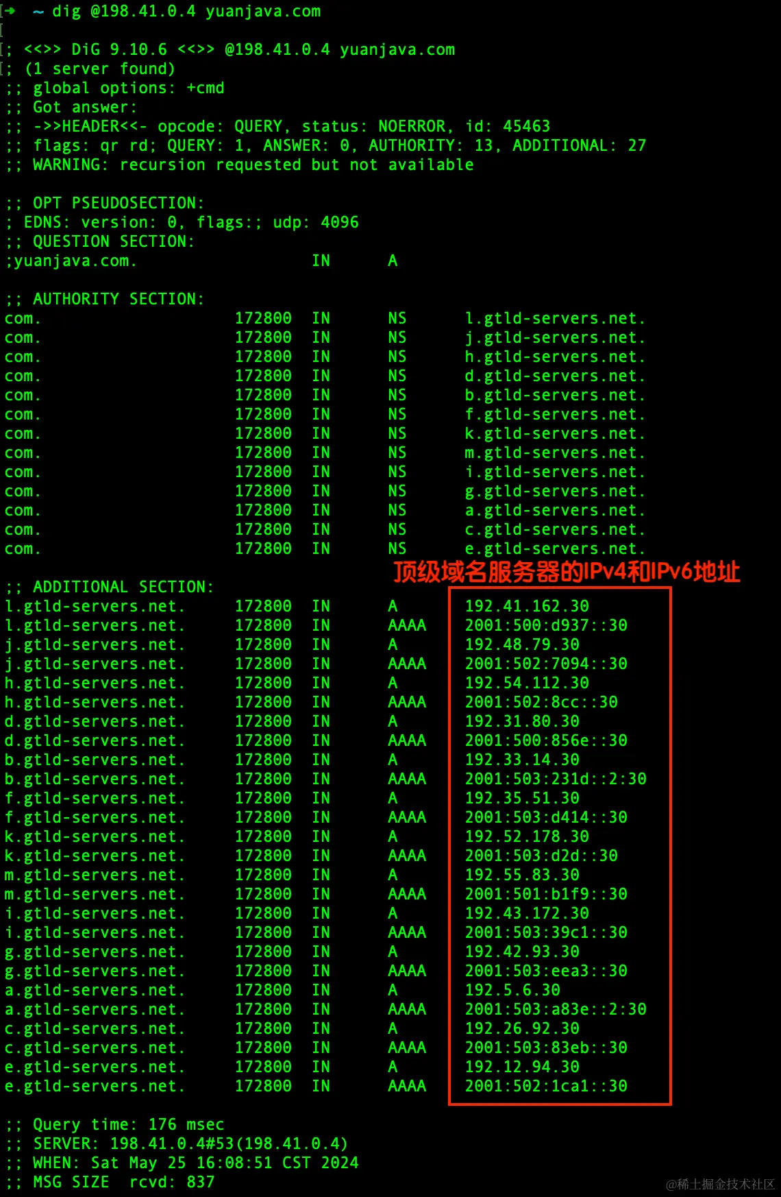 指令执行如下图: 因为根域名服务器给不了"yuanjava.com"的 IP地址,所以执行结果中没有 ANSWER SECTION,但是返回了.com对应的顶级域名服务器的 IPv4和 IPv6,选择第一台顶级域名服务器的IPv4,继续解析,指令如下: