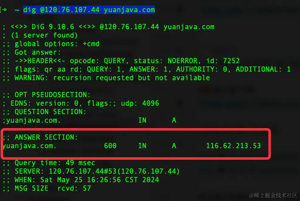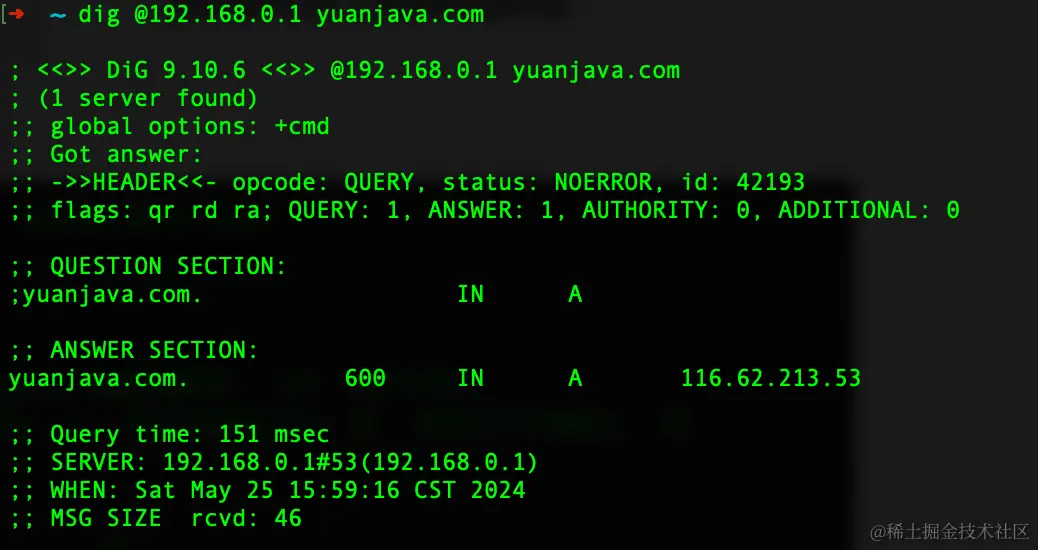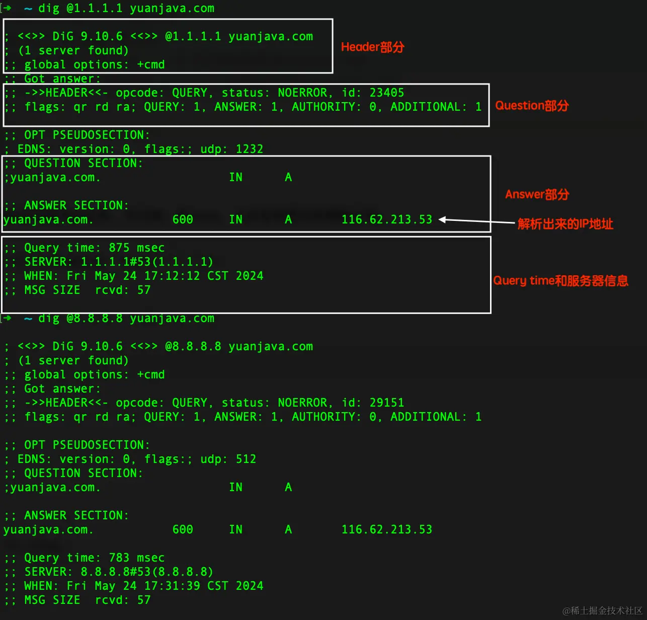使用示例 dig yuanjava.com A # 返回 yuanjava.com的 IPv4地址记录 dig yuanjava.com AAAA # 返回 yuanjava.com的IPv6地址记录 dig yuanjava.com MX # 返回 yuanjava.com的邮件交换记录 dig @8.8.8.8 yuanjava.com #指定 Google公共的 8.8.8.8 DNS服务器查询 yuanjava.com dig @1.1.1.1 yuanjava.com #指定 cloudflare公共的 1.1.1.1 DNS服务器查询 yuanjava.com 2.结果返回