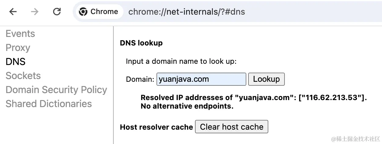 DNS缓存因为一个域名对应的 IP地址变动的频率很低,所以,可以将域名和 IP的映射关系缓存起来并且设置一定的失效时间,从而提高数据请求的性能和可靠性。那么,DNS缓存有哪些呢? 浏览器的DNS缓存现代 Web浏览器的设计,默认会将 DNS记录缓存一段时间,当发出对 DNS记录的请求时,能从浏览器缓存拿到记录,大大加速了 DNS解析过程。 在 Chrome浏览器中,可以通过