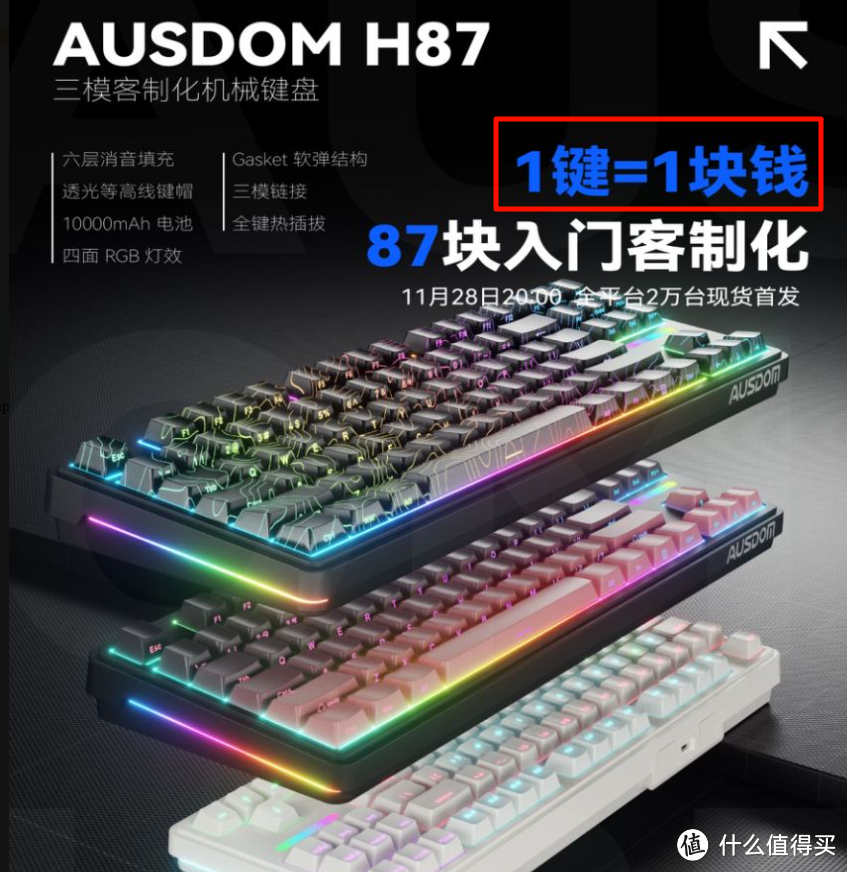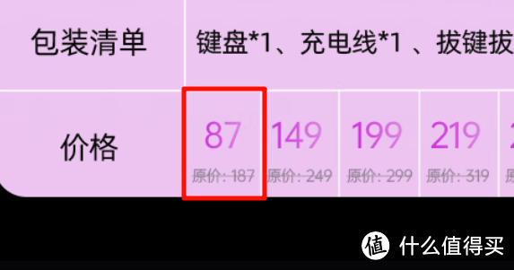 说实话,阿斯盾确实有东西,不服不行。这个键盘基本上能做到杀死比赛,前提是他继续卖87块钱。 这里写的是原价187,减了100。至于他什么时候恢复原价,不知道,反正现在很有性价比。