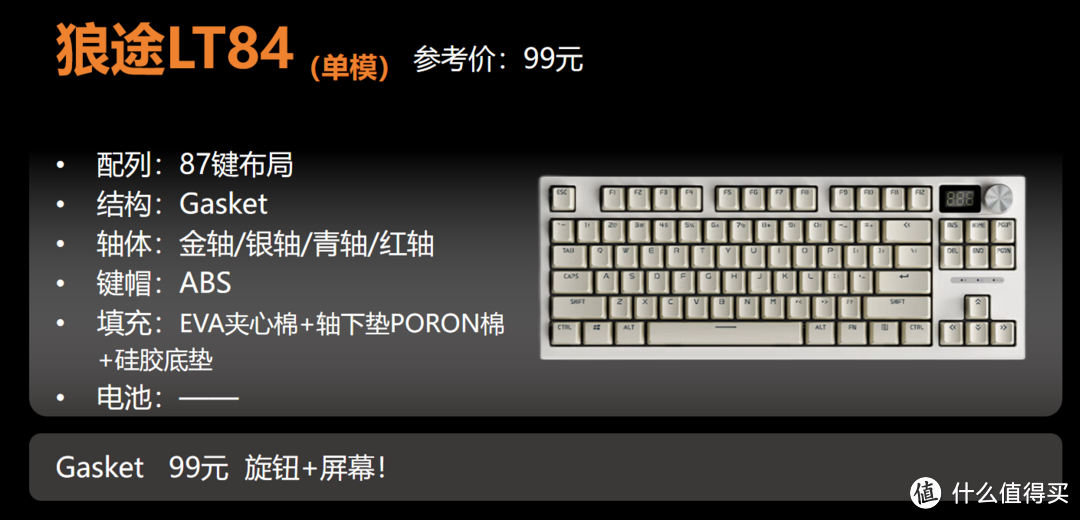 不过,99元的小屏幕只能显示LOGO,这也能砍一刀是咱没想到的。 84键布局足够绝大多数人用,那些功能键你一辈子不一定用的上一次... 轴体方面,有四种轴体可选:金轴,银轴,青轴,红轴,除了金银轴可能要理解一下,青轴红轴都是大伙熟悉的。 狼途这个LT84最丐的单模版本,虽然不是最好看的,也不是最大牌的,但在100元价位段,一定是性价比最高的。