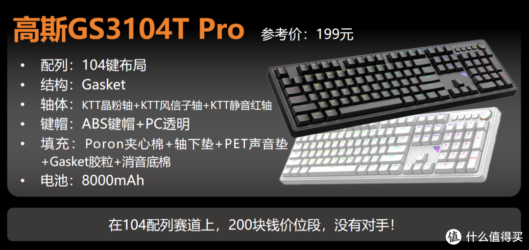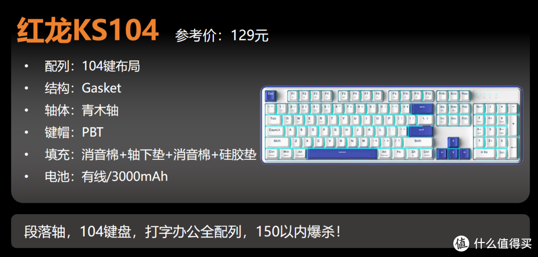 没想到,这个键盘居然能坚持到现在,果然,性价比的光辉是不会随着时间而褪去的。退潮之后才知道谁在裸泳。 只能说,104配列低价位能选的不多,再加上段落轴,那就可能只剩他一个了。129元、全尺寸、PBT键帽,虽然对比狼途的LT104看起来没那么有性价比,但是这是PBT键帽,更偏实用性。唯一推荐的版本是单模有线版。也就是这样才能做到150元以内。