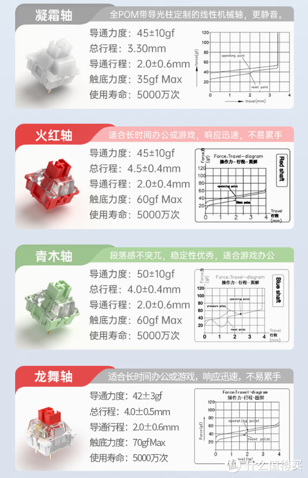 轴体有四种,凝霜轴,火红轴,青木轴,龙舞轴。四个轴体都有防尘壁,更稳定,好评。 如果喜欢段落轴,建议考虑青木轴。
