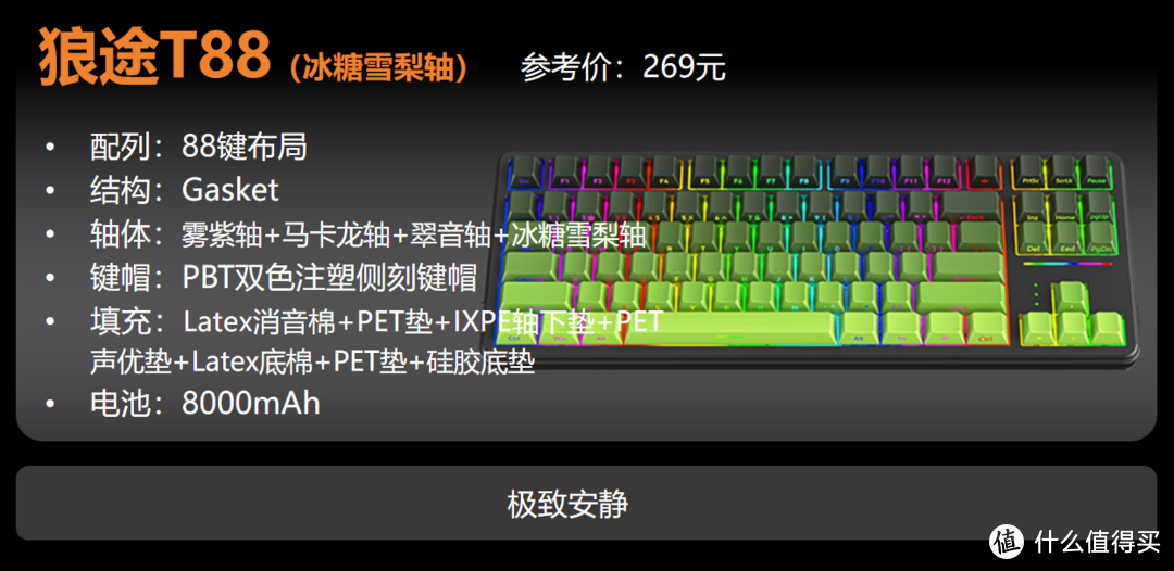 狼途这个键盘其实本身比较大众,但是因为冰糖雪梨这个轴体再加上填充比较多,达到了7层。可以达到一个极度静音的效果,几乎没什么声音,就只有指尖敲击键帽的声音。