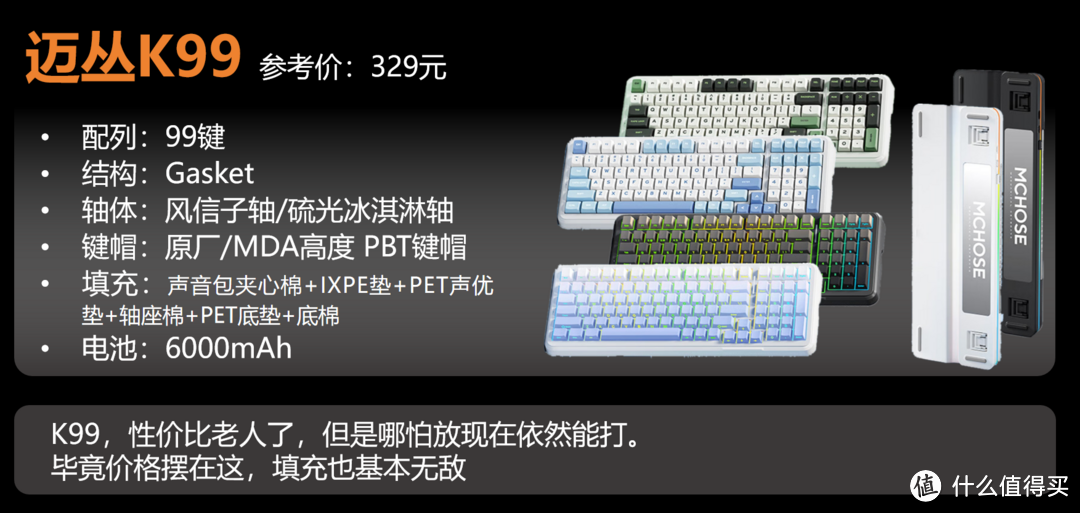 这里基本属于掐架第二狠的价位段,各家都在军备竞赛,杀价的杀价,卷配置的卷配置。就看谁最狠。 同质化严重之后,消费者能力有限,总不可能一个人买好多键盘吧,厂商只能互相掐架,抢占对方的份额。 这个价位段普遍开始脱离公模设计,价格不会卡那么死,总得整点花活儿对吧。 迈丛K99