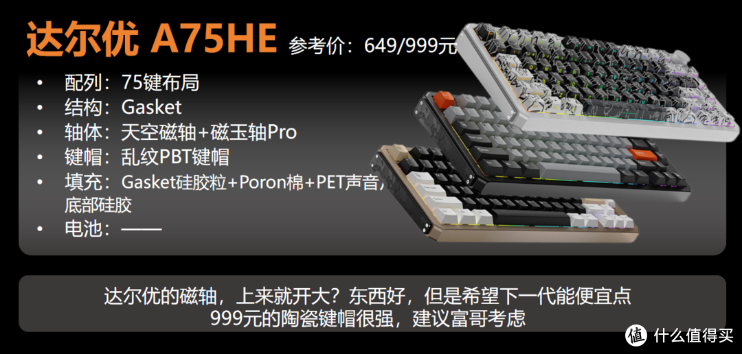 全铝高配版推荐顶配的陶瓷白,独一份陶瓷键帽+相对适用更广的磁玉轴Pro,999元。看起来单价高,不过,全陶瓷键帽+磁玉轴Pro也撑得起来这个价格。更多是整活儿,实用主义的不用看这个配置。