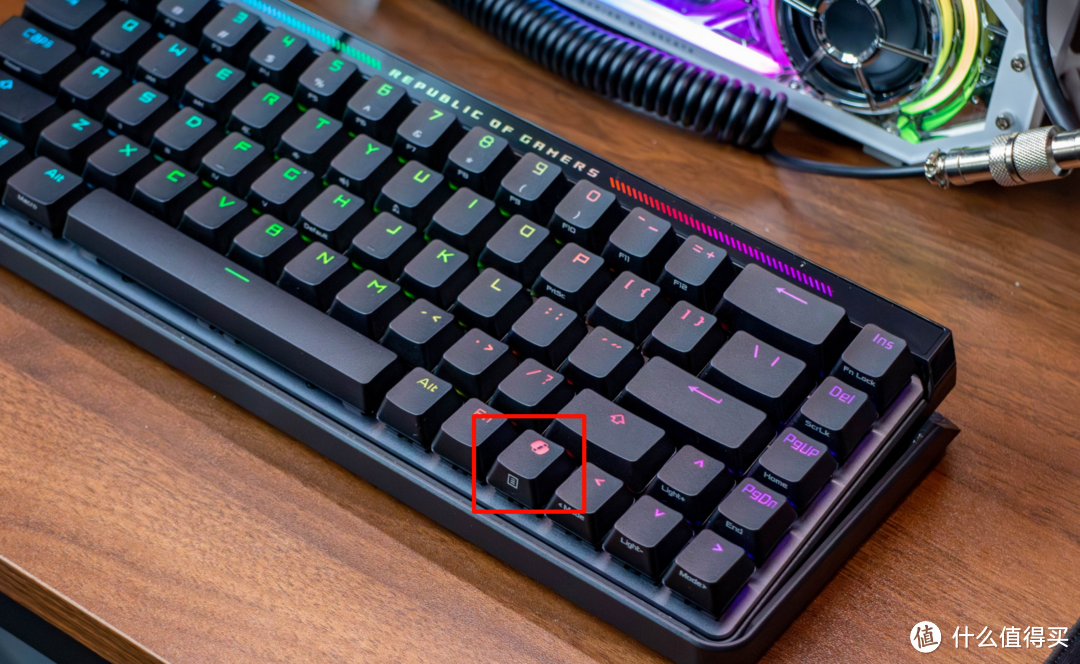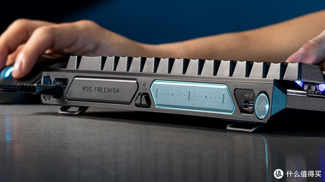 ROG这个磁轴键盘,完成度很高,甚至可以借助Smart Bar触控条直接修改轴体触发行程。ROG 魔导士ACE HFX依然采用65键布局,算是延续魔导士小键盘的整体思路。 轴体采用ROG HFX磁轴,瑞翼鲨代工,初始压力40gf,触底压力55gf。POM轴心+PC上盖。回弹有力,打字也可以用。 键帽有ABS和PBT两个版本,PBT也做了字透,PBT版本贵100块钱,但是值得。磁轴键盘普遍都是有线单模,ACE HFX也不例外。 ROG魔导士曾经的拿手绝活:左右双C口,在这里优势非常大。这点看起来没啥,如果你桌子比较小,很难排开位置,你就会发现这个设计的价值。