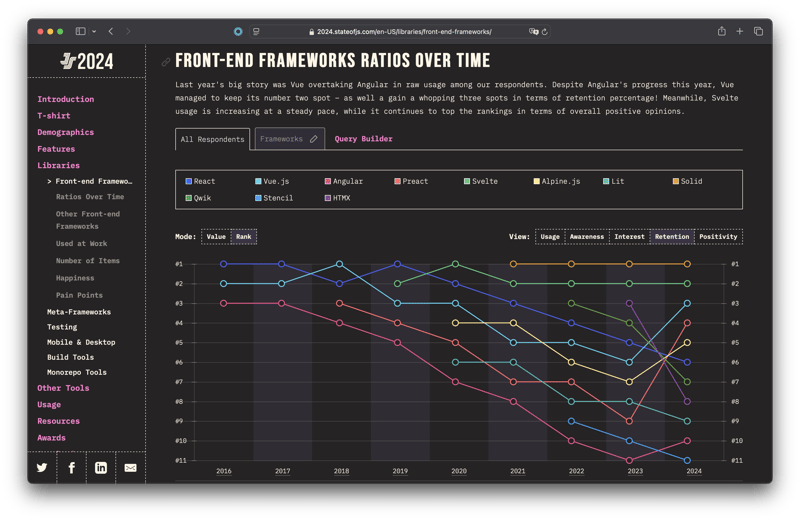在深入探究细节以前,咱们先来瞧瞧这些框架的受欢迎程度。在这一方面,我最为青睐的指标是 “JavaScript 状态调查”。由 Devographics 每年开展一次的这项调查,其最新的结果于 2024 年底公布 —— 恰好在这篇博客文章发布的几天之前。🔥