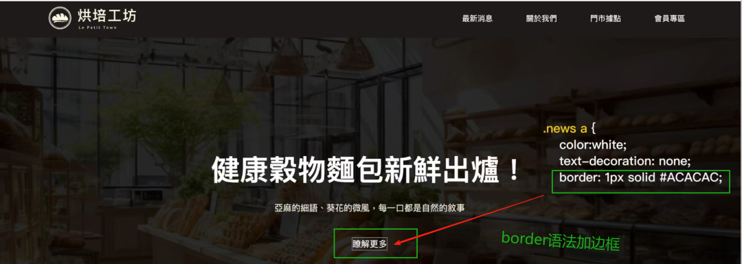 .news a {                    /* 选择所有在.news类元素内的超链接(<a>标签) */    color: white;              /* 设置链接文字颜色为纯白色 */    text-decoration: none;    /* 去除链接默认的下划线效果 */    border1px solid #ACACAC/* 添加1像素宽、浅灰色(#ACACAC)的实线边框 */    padding10px 20px;        /* 设置内边距:上下各10px,左右各20px */    border-radius5px;        /* 为元素添加5px的圆角效果 */}