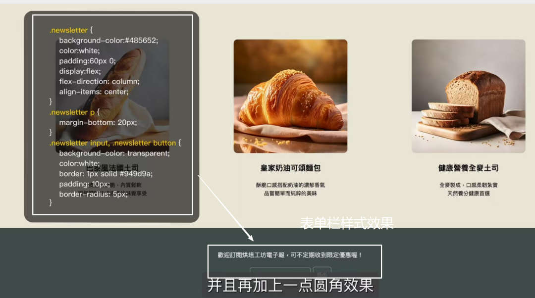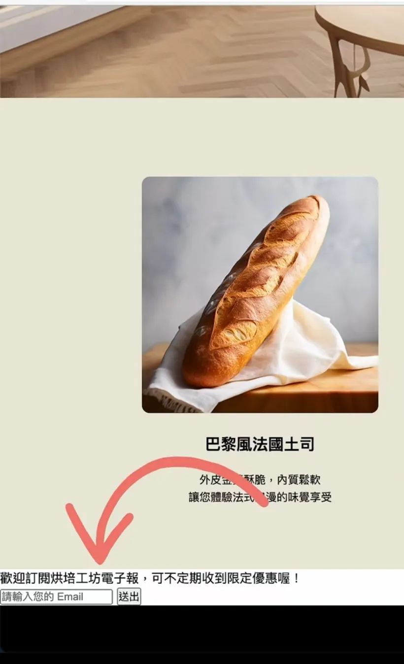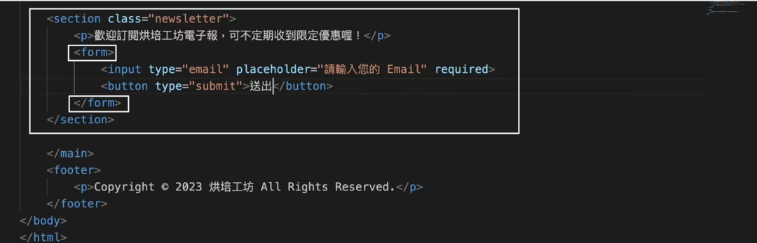 <section class="newsletter">  <p>歡迎訂閱烘培工坊電子報,可不定期收到限定優惠喔!</p>  <form>    <input type="email" placeholder="請輸入您的電子信箱">    <button type="submit">提交</button>  </form></section>