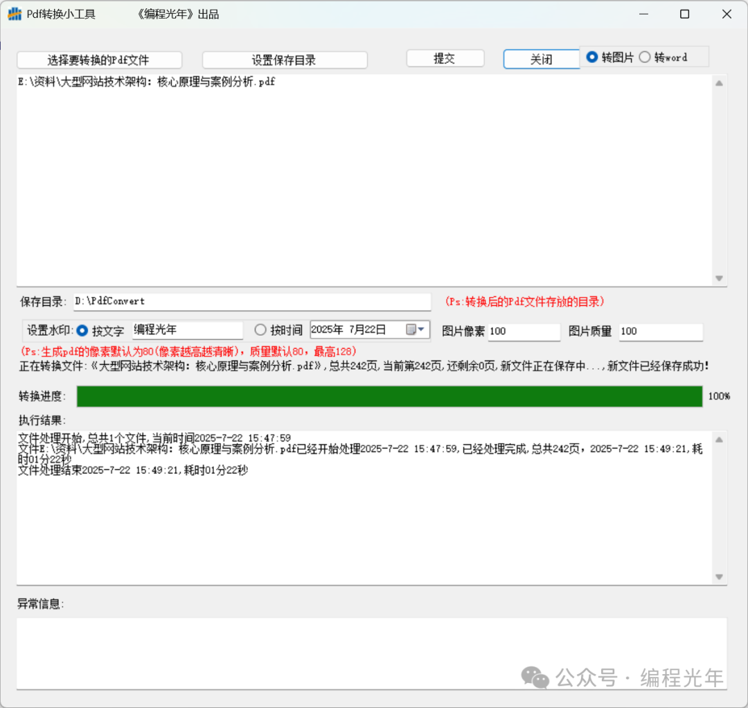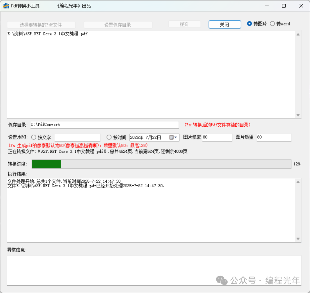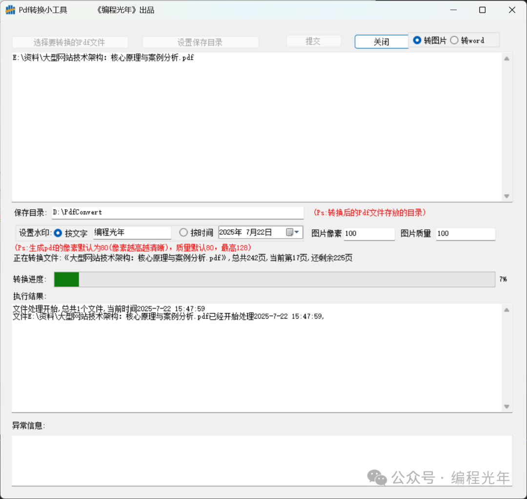 此工具可以轻松的实现将pdf文件按照顺序转换为图片文件与word文档,支持设置水印与清晰度操作也很简单,首先选择要转换的pdf文件,然后设置转换后保存的目录,提交等待即可。