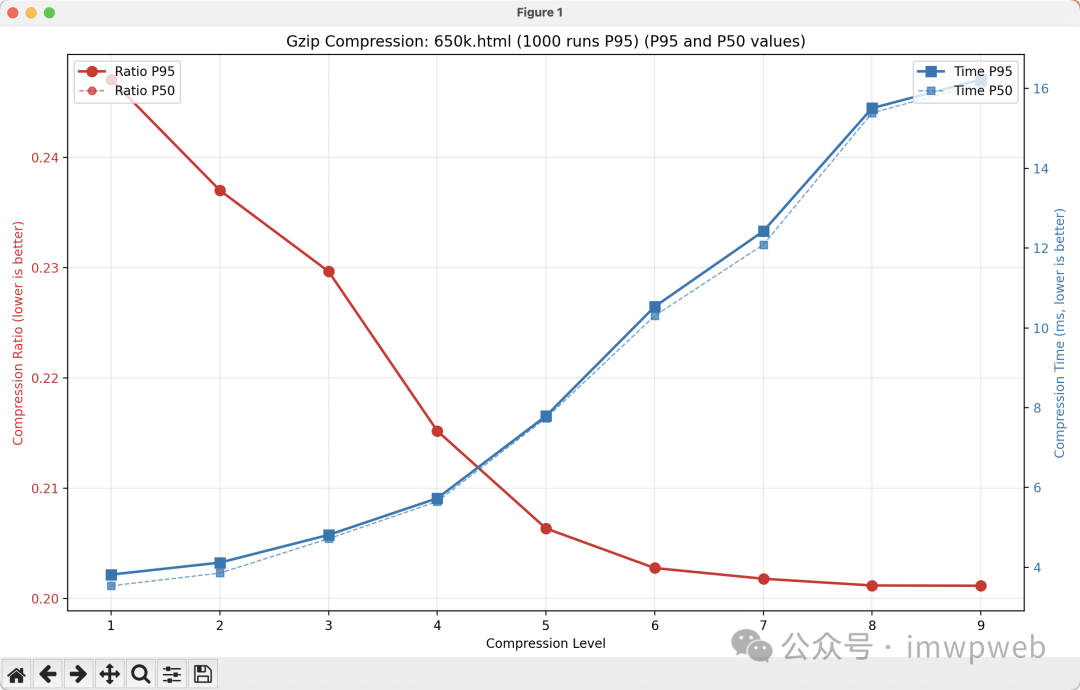 看起来和 50k 的网页曲线很相似。其原因是 50k 的网页是我从 90k 的网页截取一部分得来的。在压缩比为 6 之后,压缩率下降不明显,然而执行耗时上涨迅速。这个数据也是在 6 以后压缩率就不明显了。压缩耗时一直上涨。同样还是在 6 以上压缩率就下不去了,而压缩时间一直随着压缩级别上升而上涨。