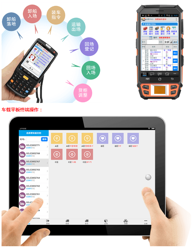 移动终端方案:结合手持终端和自动识别系统,实现集装箱信息的自动读取、状态实时变更,以及后方对前方货物的实时监控。