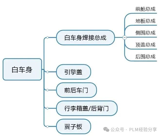 - 汽车的白车身也是汽车的BOM中最复杂的,尤其结合冲压、焊接和涂装的工艺,有些企业将BOM可以设计到9-10层,但这么复杂的BOM,对于汽车BOM的配置化管理也是很大的挑战,因此目前很多汽车企业都对车身的结构组成进行了优化,包括组件模块化和工艺集成化,组件模块化主要是对车身的组成再次扁平化,例如白车身焊接总成默认是5大件,但实际有些企业可以划分更多,这样减少不必要的过程BOM层级,其次是对车身冲压工艺的改善,例如以前存在大量的焊接组件,但随着大吨位冲压和一体化成型技术的发展,将传统汽车甚至达到上千零件焊接控制到300左右,特斯拉Cybertruck甚至达到100个;当然汽车行业发展标准化程度非常高,不同企业在进行产品结构规划和BOM的设计时,也都会参考对应的国家标准行业规范等,例如QC/T 265等