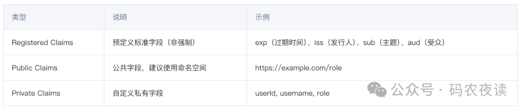 - Payload负载:实际存放的数据,可以自定义,主要有以下字段。