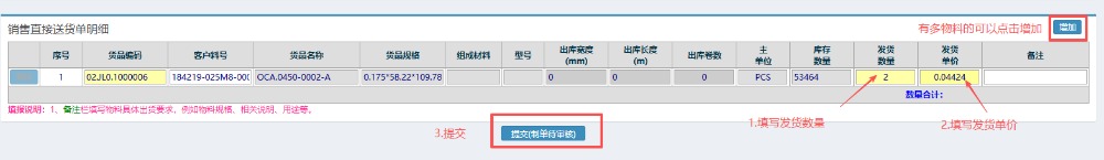 3.接下来就是点击“货品编码”,会弹出物料信息界面。 弹出界面之后,先选择物料大类,然后点击查询(找不到可用编码或名称筛选),再点击选择对应的物料信息。 4.选好物料后,按图操作:填写好发货数量和发货单价,有多物料需求的可以增加,没有就无视。最后提交审核。 5.提交审核之后,回到左侧功能菜单里找到“成品送货单管理”。 6.进入界面后,按图操作:点击选择收货客户,然后再点击查询。 ![]() 7.查询后,下方会显示所有的出库单,根据出库类型:出库预订单进行查找,点击对应送货单,点击发货。