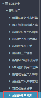![]() 1.进入ERP系统之后,点击“BOE定制”,点开“正常加工”,找到“新增成品送货单”。 2.进入界面之后,按图操作:点击选择销售客户,然后再点击选择送货类型。