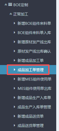 2.进入界面后,按图操作:选择订单来源,备注有需要可补充。 3.接下来在下方找到“货品编码”点开,会有物料信息弹窗。 在弹窗的信息窗口内,按图操作:点击选择物料大类,点击查询。然后点击对应物料信息。 4.选好物料后,按图操作:填写排产量,填写日期,然后点击提交。 5.提交完后,回到左侧功能菜单里找到“成品加工单管理”