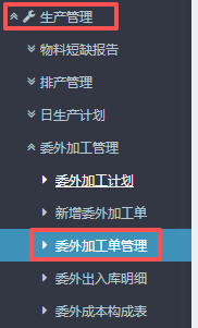 1. 进入ERP系统之后,在左侧的功能菜单里找到“生产管理”,点开“委外加工管理”,点击“委外加工单管理”。