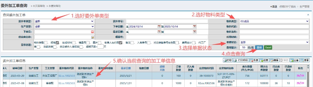 2.进入页面后,按图操作:选好委外单类型物料类型以及单据状态,然后点击查询。在下方得到当前确认的加工单信息