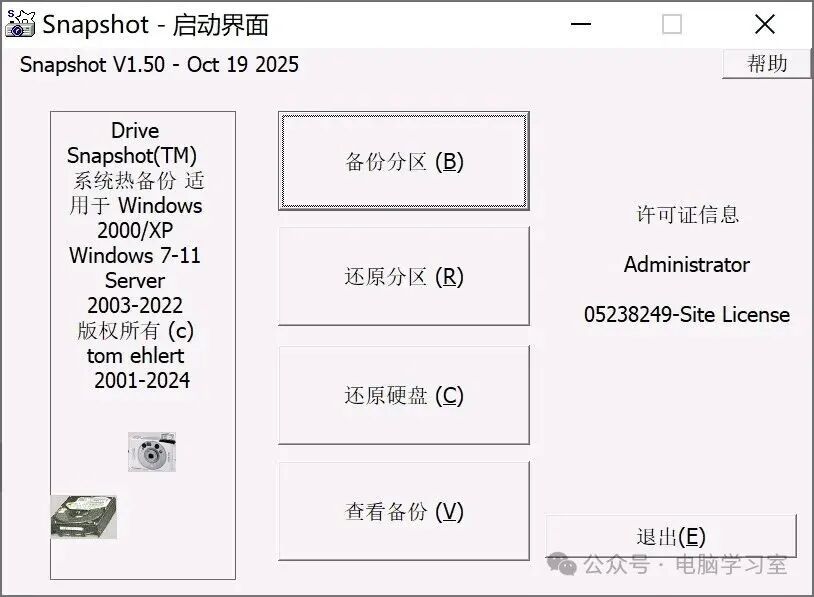 今天给分享一款小巧强大的系统备份还原软件--Drive SnapShot,v1.50.0.1748新版本(2025.10.19)大小仅3MB,中文绿色便携版