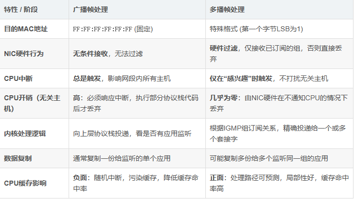 这里的CPU开销是有效且必要的。与广播不同,CPU处理这个多播包的工作不是“白费力气”,而是为了满足应用程序的实际需求。