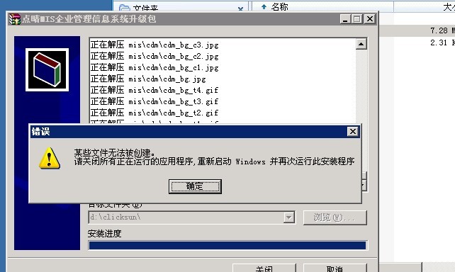 我安装点晴永久免费OA升级主程序包时提示“某些文件无法被创建”,如何处理?